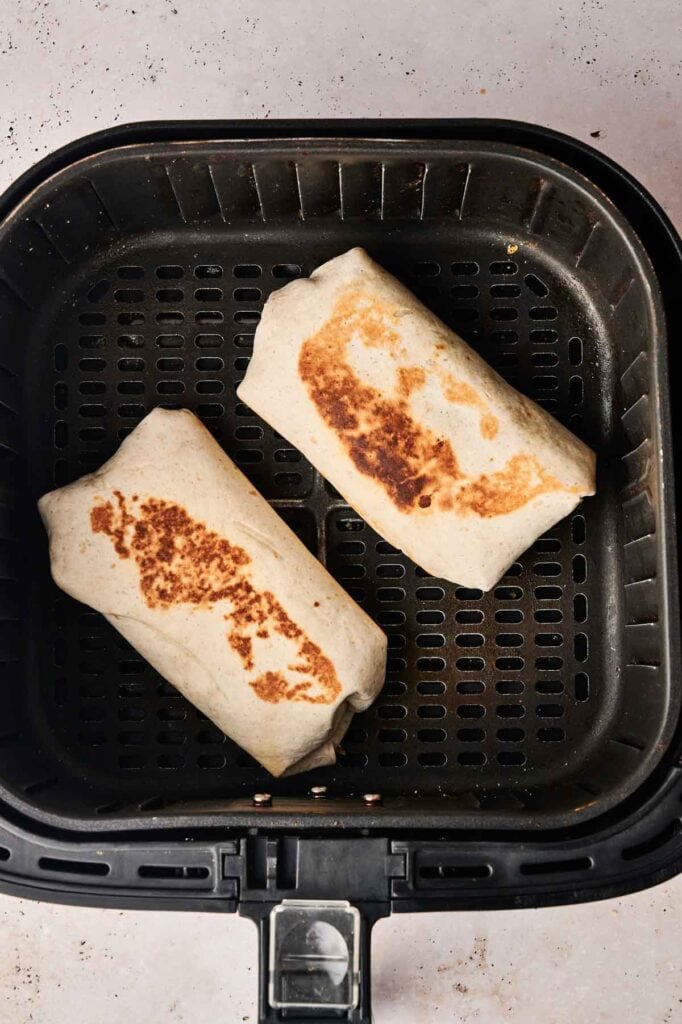 Place the burritos in the basket and cook at 350°F (180°C) for 4 minutes. Flip them carefully and cook for 4 more minutes until the tortillas are golden and crispy on the outside.