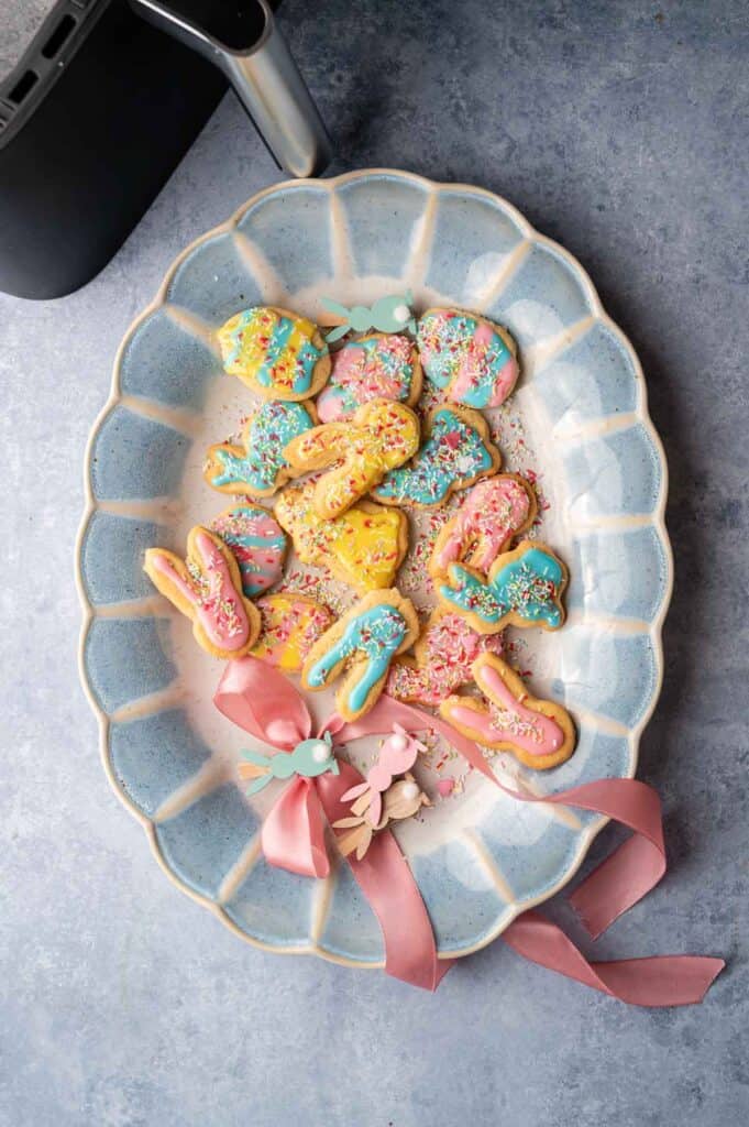 I usually serve mine on a beautiful, large oval serving platter or a tiered porcelain tray stand if I’m hosting buffet-style. These air fryer cookies also travel beautifully to school parties, Easter gatherings, and spring potlucks.