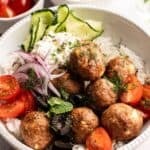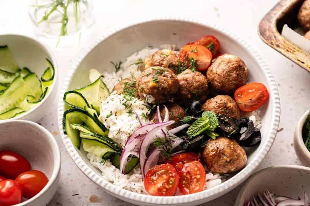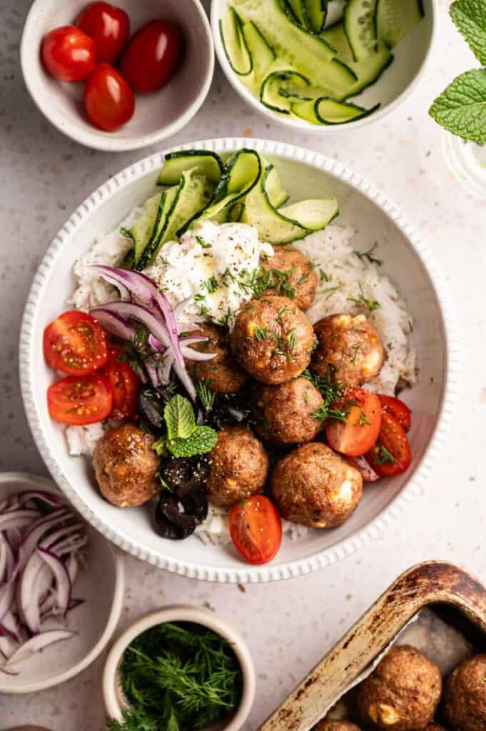 I love making these for weeknight dinners, game day parties, holidays, and potlucks because they’re incredibly flavorful, filling, and absolutely stunning in a bowl with all the fresh Mediterranean toppings. They reheat beautifully, which makes them perfect for lunches throughout the week too. Store leftover meatballs in the fridge for 3 to 4 days or freeze for up to 2 months.