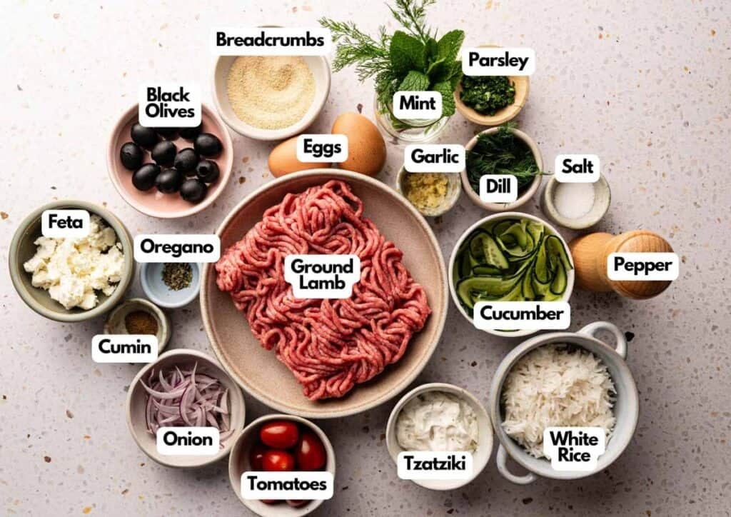 - In a large bowl, combine ground lamb, garlic, eggs, breadcrumbs, herbs, spices, feta, salt, and pepper. Mix gently with your hands until just combined.2 pounds ground lamb, 3 cloves garlic, 2 large eggs, ¼ cup breadcrumbs, 1 tablespoon fresh parsley, 2 teaspoons fresh mint, 1 teaspoon dried dill, 1 teaspoon ground cumin, 1 teaspoon dried oregano, ¾ cup crumbled feta cheese, Salt and black pepper