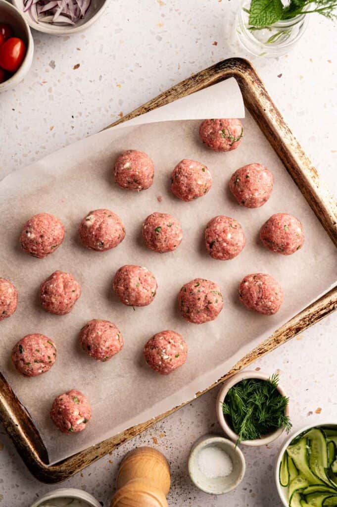 Scoop and roll the lamb mixture into 1½-inch meatballs and space them evenly on your prepared baking sheet. Using a cookie scoop keeps every meatball the same size, which means they’ll all cook through at the same rate.