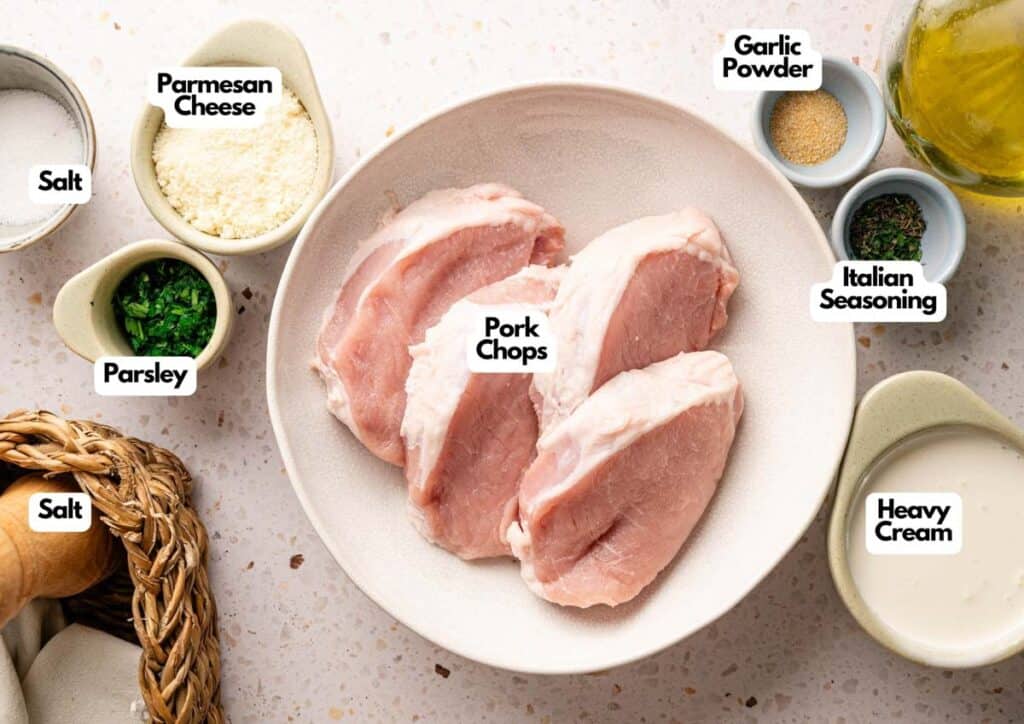 What you’re making here is essentially a creamy gravy that thickens and clings to the pork chops as everything cooks together. If you want to swap the heavy cream, condensed cream of mushroom soup works really well in its place and gives the sauce a slightly earthier, equally creamy gravy-style result.