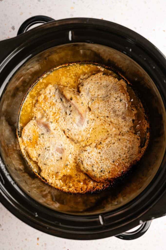 If you have bone-in pork chops on hand, those work great here, too. You can also quickly sear them in a little olive oil before adding them to the slow cooker for extra color on the meat, though it’s completely optional.
