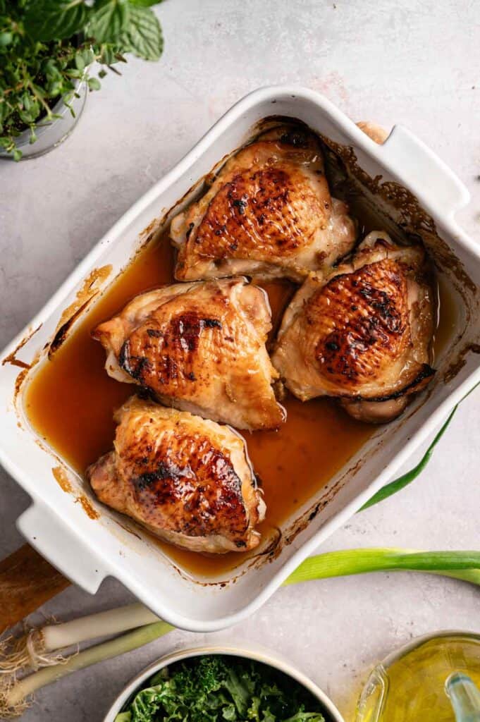 For longer storage, freeze the cooked chicken for up to three months. Wrap each thigh individually before placing them in a freezer-safe container so they don’t stick together, then thaw overnight in the fridge before reheating.